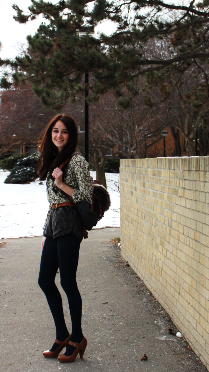 I completed this challenge by throwing together a loose cashmere t-shirt with a roomy pair of harem pants to almost make it feel as if I were at home lounging on the couch with Ben&Jerry's chocolate ice cream. To keep it from feeling sloppy I added a velvet blazer, 1 inch heels, and warm socks to play with some color. But, the item that absolutely has saved my life throughout the duration of the day is my fur backpack! It's more comfortable to carry then a purse and can fir everything from my shopping bags, my camera, and all my daily essentials! I have no doubts that this soon will be the only bag I carry!